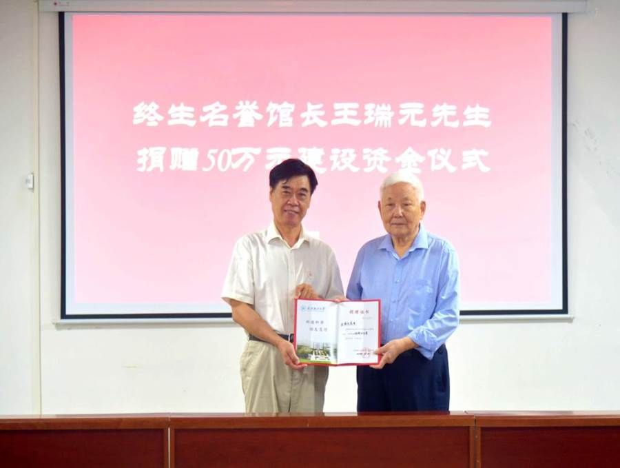 董仕节(左)向王瑞元(右)颁发捐赠证书