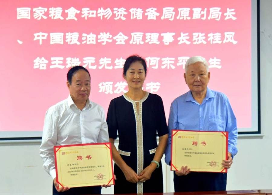 国家粮食和物资储备局原副局长、中国粮油学会原理事长张桂凤(居中)向油博馆终身名誉馆长王瑞元(右)、油博馆馆长何东平(左)颁发聘书